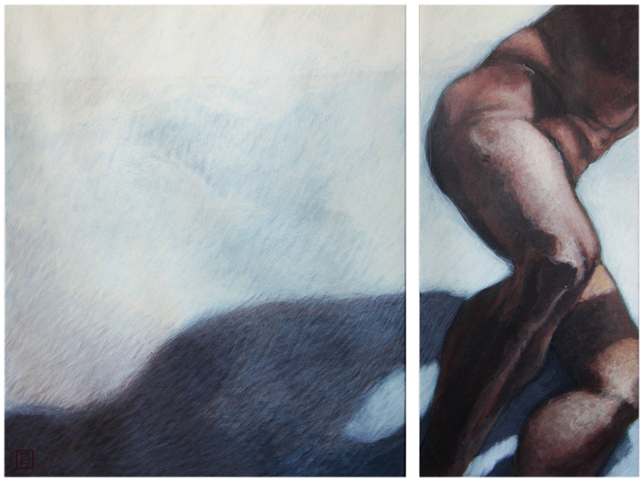 processus d’ajout puis de retrait de matière. Chacune présente une étape dans laquelle l’obscurité domine dans l’espace pictural. S’ensuit un travail de retrait de la matière sombre, de sculpture de «l’entour». Les formes corps et ombre ne procèdent pas du travail sur elles-mêmes, mais de la constitution de la matière qui à la fois les contient et les définit ; dans une attention portée à l’espace, à ce lieu, dans lequel la rencontre se joue.