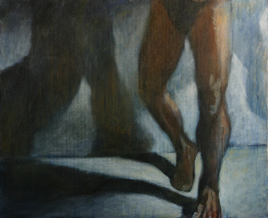 Le corps masculin apparût dans mon travail à partir d’une longue série sur les mains qui entraient en relation avec un corps dont seul un fragment était visible. Les mains n’étaient pas engagées dans une gestualité discursive claire et univoque : le contact avait-il lieu, était-ce une approche, un effleurement, un retrait ? Le public était invité à avoir sa propre lecture, à recréer son propre sens. Puis vînt un travail où pieds et jambes figuraient dans un même espace de représentation. Déjà l’ombre y prenait place. Peu à peu, l’importance de l’ombre progressait.