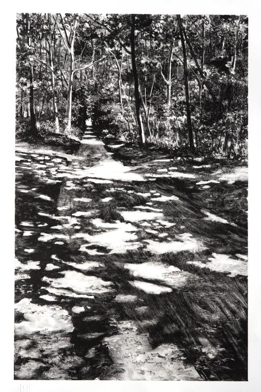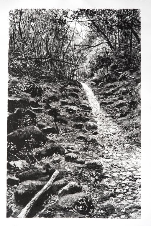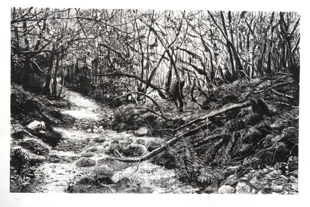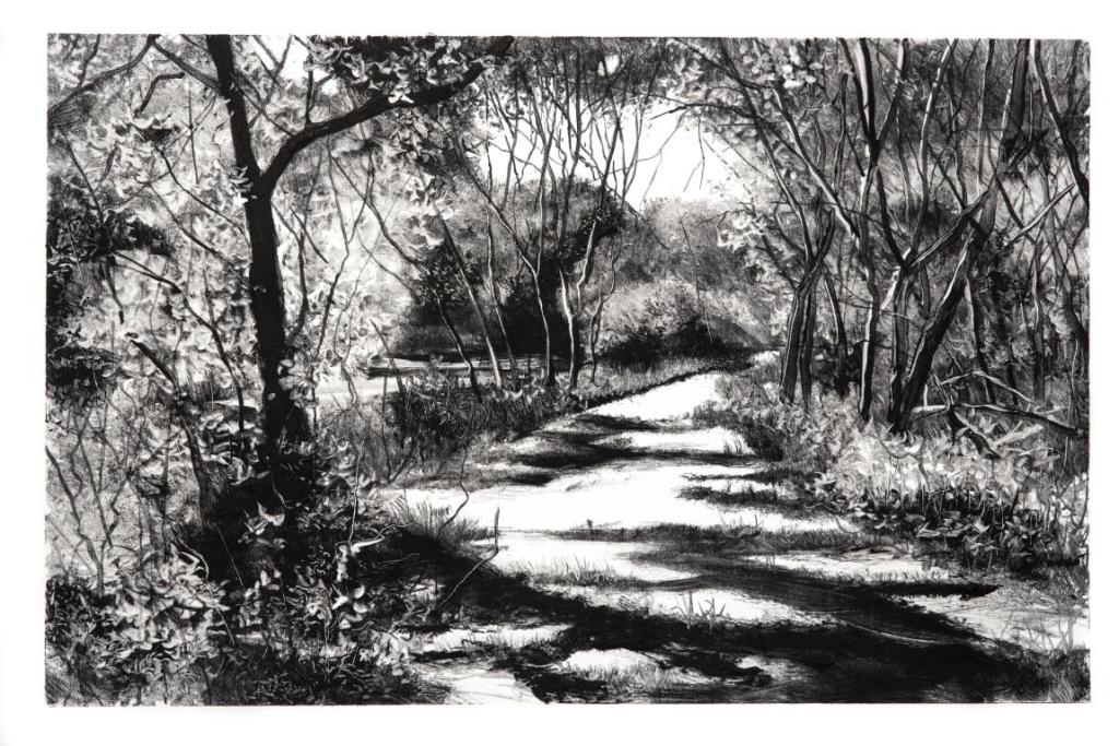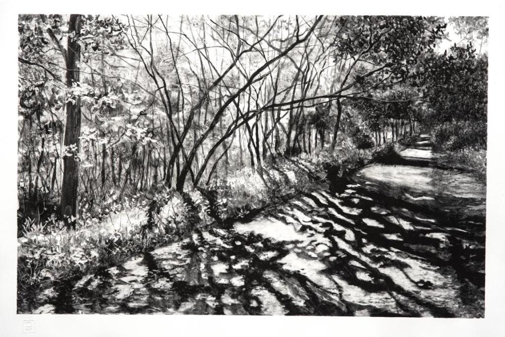 Une feuille de papier humide est alors couchée sur la plaque de verre. Tout se rejoue, encre et papier s’unissent, une nouvelle image naît et se dévoile. Le tirage est unique, pas de reprise ni de repentir. De la blancheur du papier, la lumière sourde au travers les plans d’ombre… réminiscences en contre-jour…